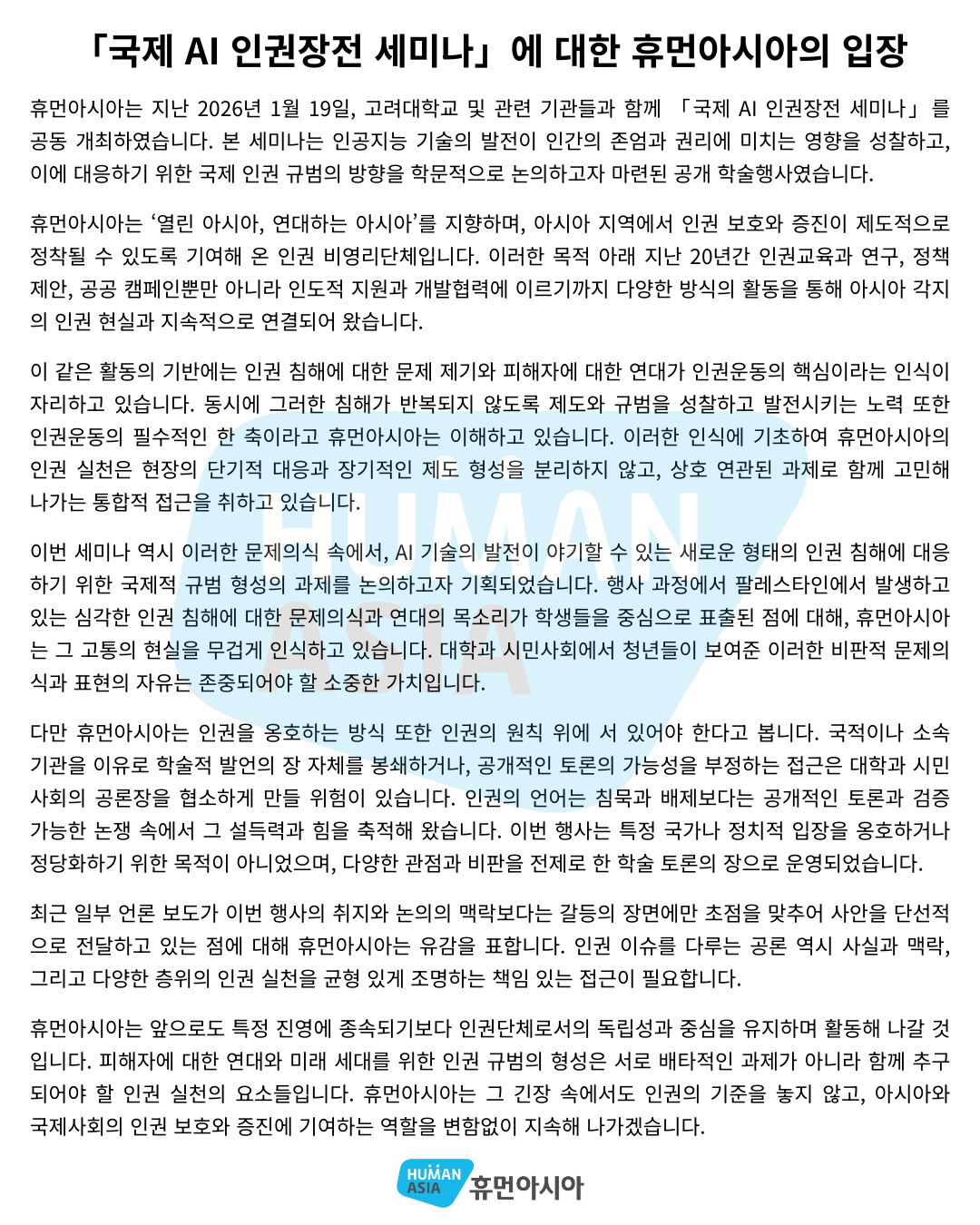 사단법인 휴먼아시아는 인권 연구, 교육, 인권기반 개발협력 사업 수행 등을 통해 아시아지역 인권신장에 공헌을 목적으로 합니다.