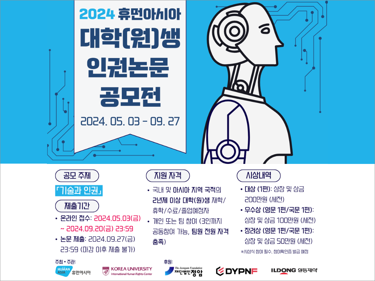 휴먼아시아는 청소년 및 대학(원)생의 인권 의식 향상 및 건강한 인권 문화 확산을 위해 인권 논문·수필·에세이 공모전을 개최합니다.